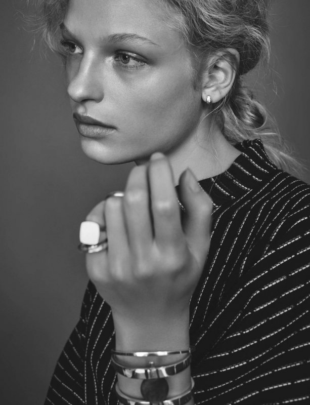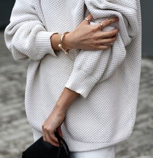 Об'ємний светр з підкоченими рукавами і браслети або колечки виграшно виглядають на контрасті. Повсякденно і витончено.