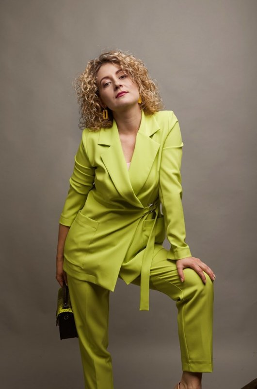 Якщо волосся забрати в зачіску, то можна одягнути кульчики тих кольорів, які є в принті піджака - сині, жовті, зелені, цегляні і навіть чорні. Та й штани можна підібрати в тих же кольорах - і образ буде виглядати по-різному.
