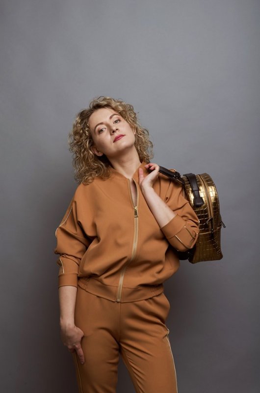 Спортивний образ з елегантною ноткою в карамельних тонах.