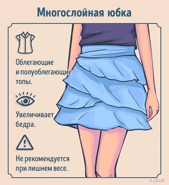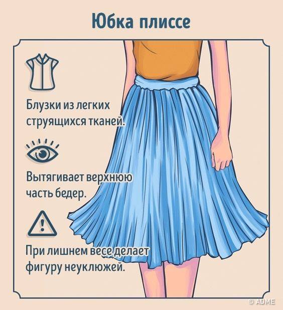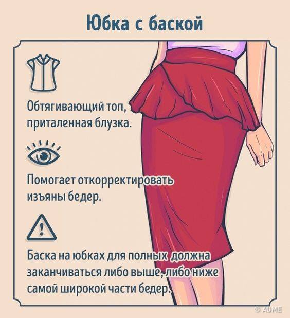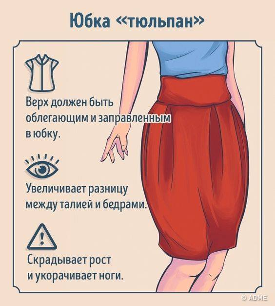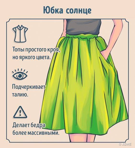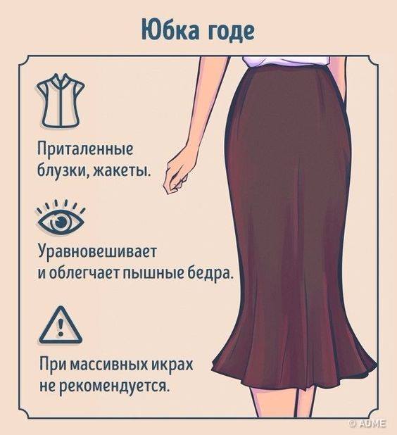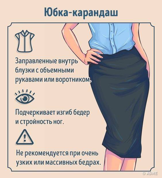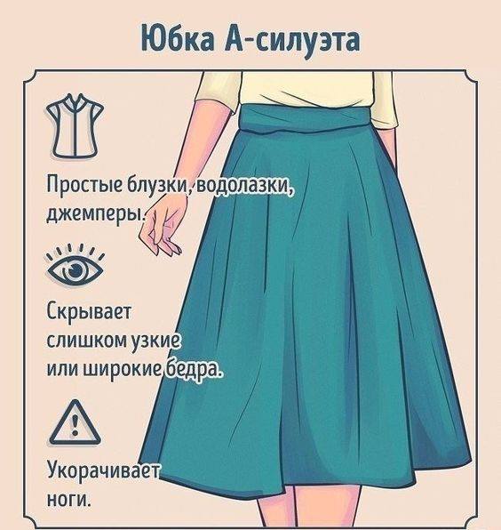Знайшла для вас зрозумілі картинки з основними фасонами спідниць та їх впливом на фігуру (зменшують чи збільшують стегна та ін.), а також, які блузки під них підбирати.