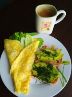 На сніданок тоненький омлет смажений беж жиру ( файна сковорода, то the best) з салатом та огірком, два бутрики з висівкового хліба, авокадо та кропу.